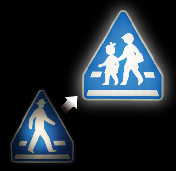標識を取り外さず、現地で交換取付が可能で、交換工事コストが下がります。複数の標識メーカーの物に対応し、五角(横断歩道)、三角(一時停止)、丸形(進入禁止、最高速度など)にも取付可能です。