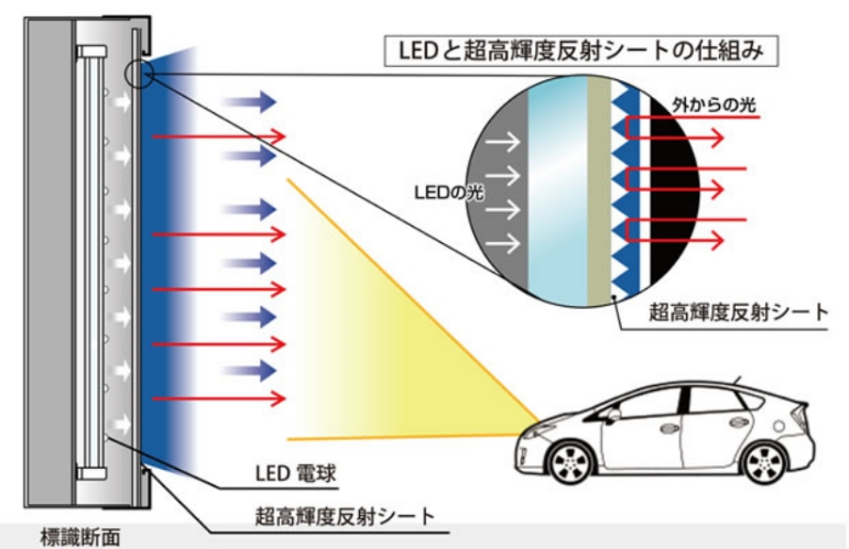 - 表面に超高輝度反射シート(広角プリズム型フルキューブDG3 )を採用することにより、内部からのLED光源と、外部からの車のヘッドライトにより、さらに高い視認効果が得られます。万が一の停電時でも、超高輝度反射シートにより標識を確認することができます。DG3は高精細プリズムカットを施したキューブレンズを反射素子に採用。